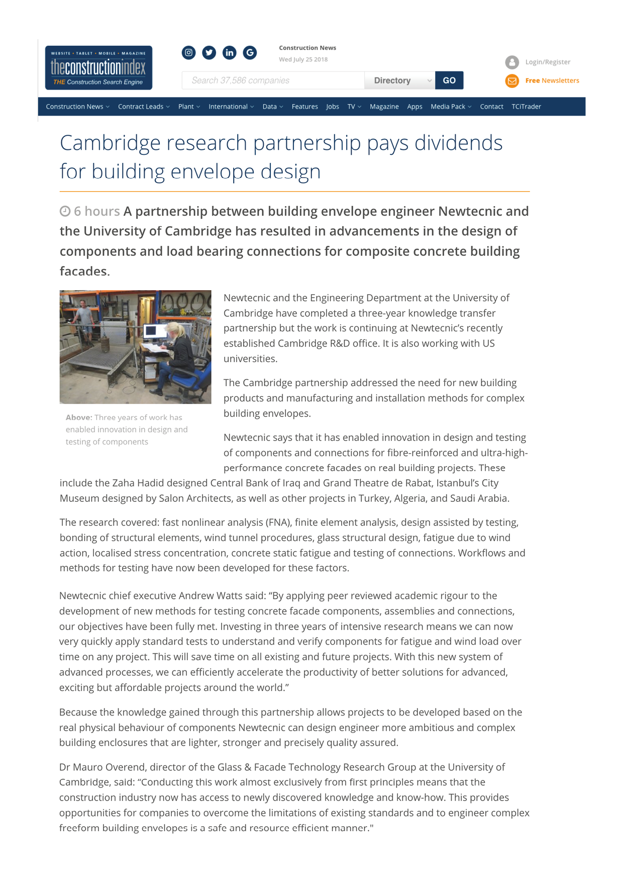 Newtecnic and Cambridge University Construction Research Partnership Delivers Concrete Facade Innovation. Premier Construction News.